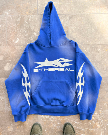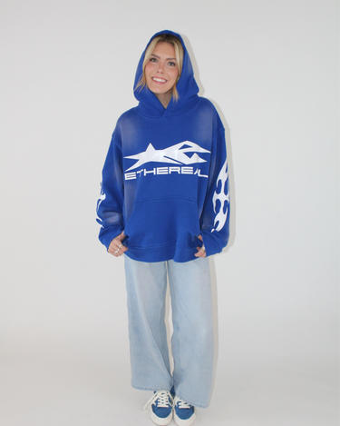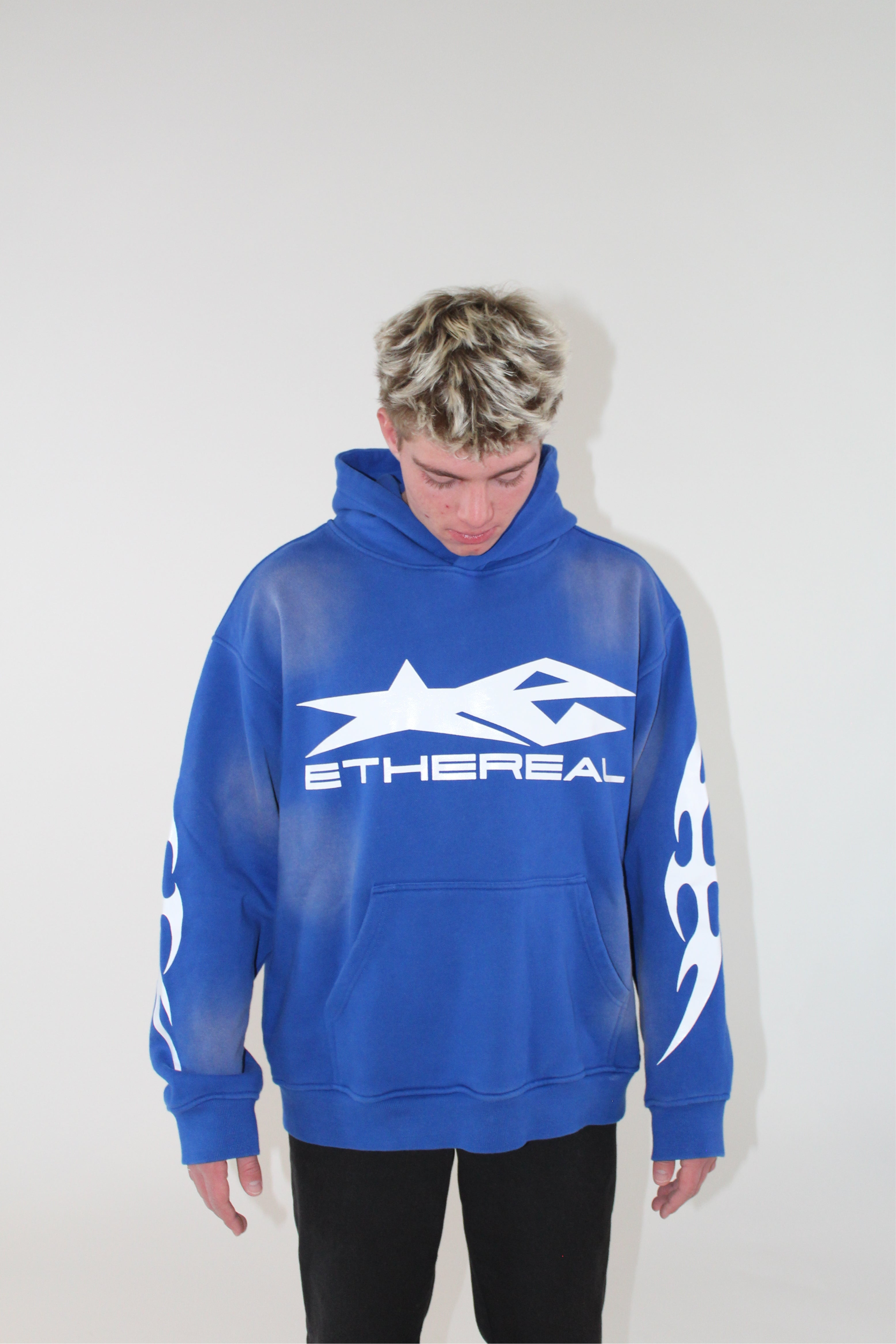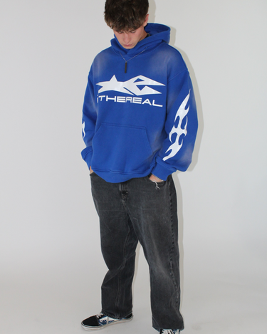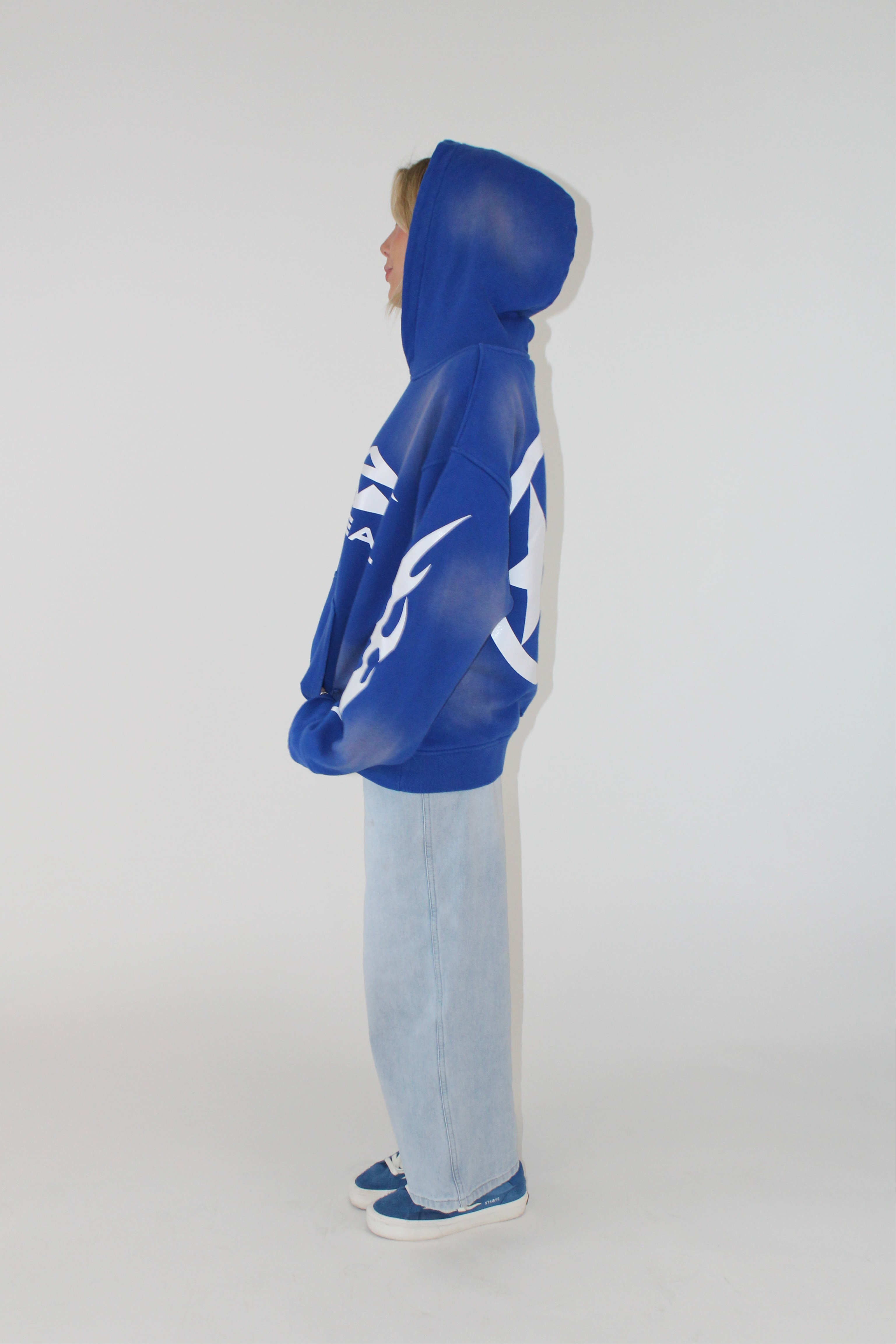 DESIGN: CRAFTED FROM 100% COTTON WITH A FRENCH TERRY INTERIOR, THIS 470 GSM HEAVYWEIGHT HOODIE COMBINES PREMIUM COMFORT AND DURABILITY. FEATURING HIGH-QUALITY GEL PRINT GRAPHICS ON THE FRONT, BACK, AND SLEEVES, ALONG WITH AN ALL-AROUND SUN-FADE FINISH IN A UNIQUE BLUE COLOR, IT DELIVERS BOLD STYLE WITH A VINTAGE EDGE. THE RELAXED, COMFORTABLE FIT MAKES IT THE PERFECT BLEND OF STREETWEAR AND EVERYDAY COMFORT.