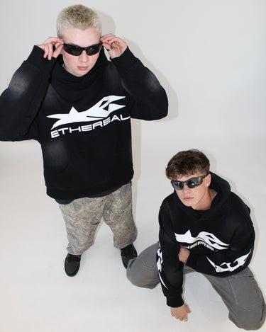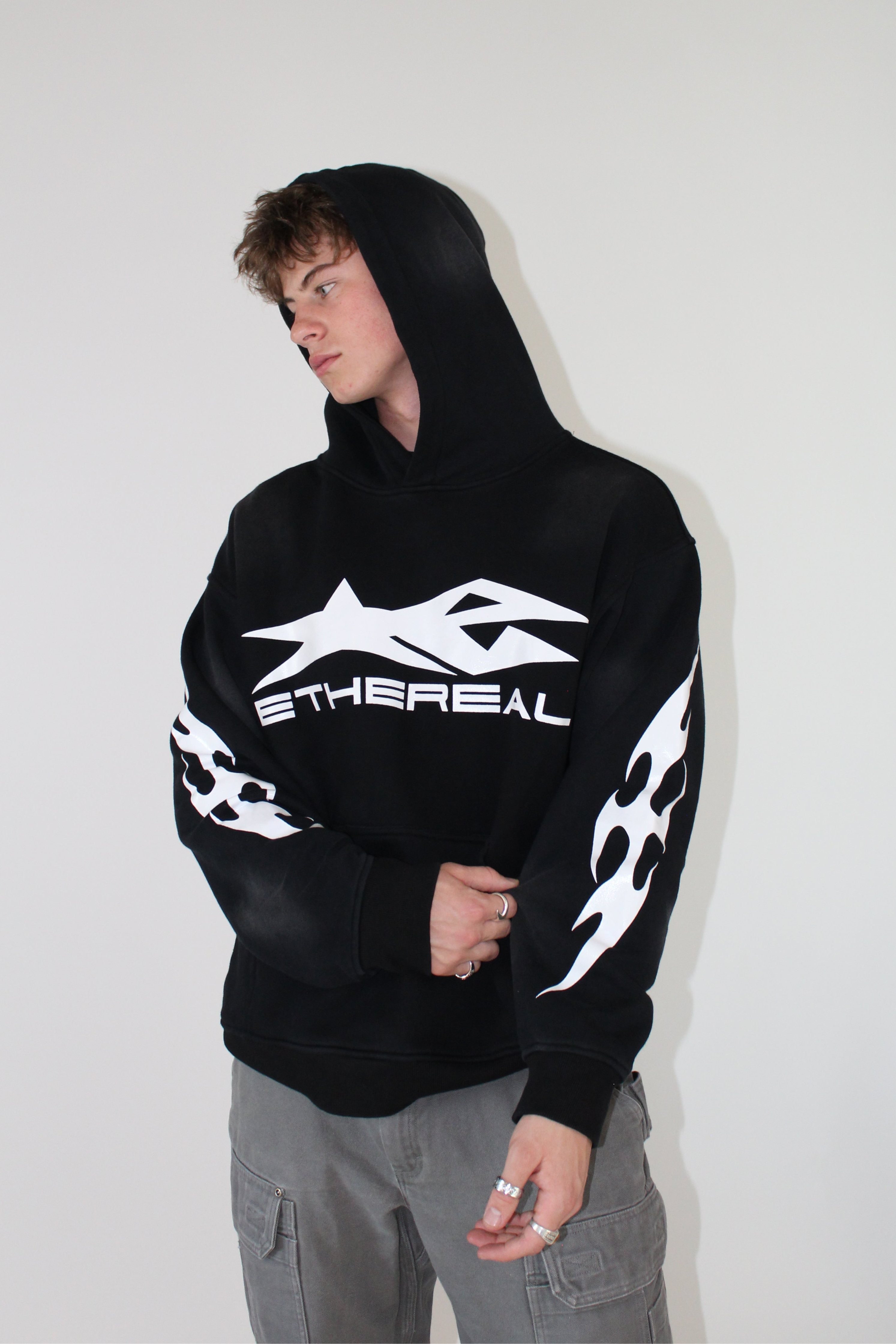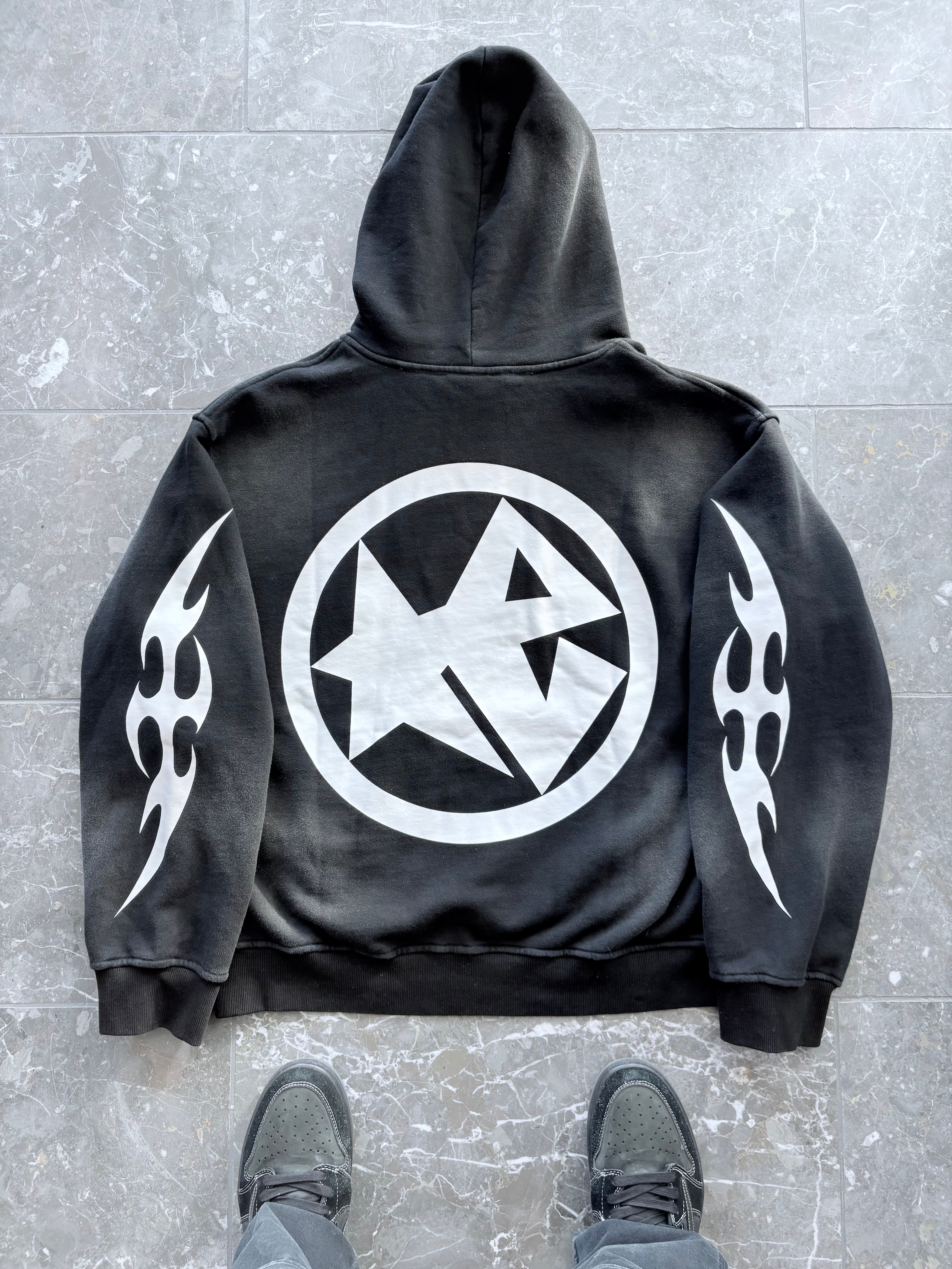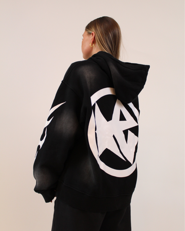 DESIGN: CRAFTED FROM 100% COTTON WITH A FRENCH TERRY INTERIOR, THIS 470 GSM HEAVYWEIGHT HOODIE COMBINES PREMIUM COMFORT AND DURABILITY. FEATURING HIGH-QUALITY GEL PRINT GRAPHICS ON THE FRONT, BACK, AND SLEEVES, ALONG WITH AN ALL-AROUND SUN-FADE FINISH IN A UNIQUE BLACK COLOR, IT DELIVERS BOLD STYLE WITH A VINTAGE EDGE. THE RELAXED, COMFORTABLE FIT MAKES IT THE PERFECT BLEND OF STREETWEAR AND EVERYDAY COMFORT.